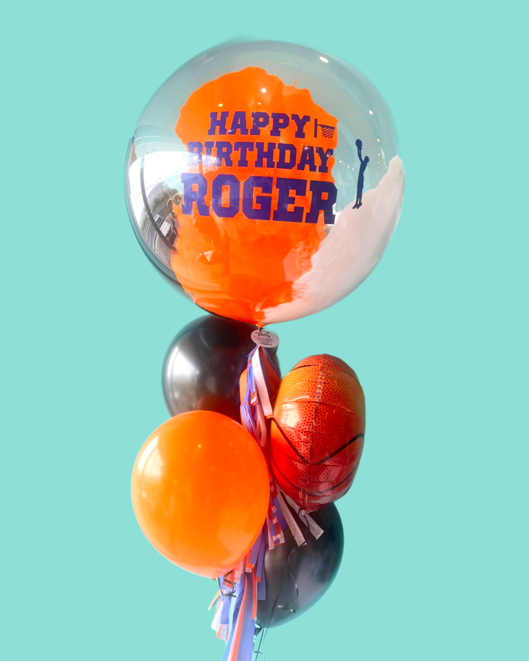Burbuja 60 cm con diseño pintura en tonos basketball, 4 globos látex y 1 globo metálico balón.