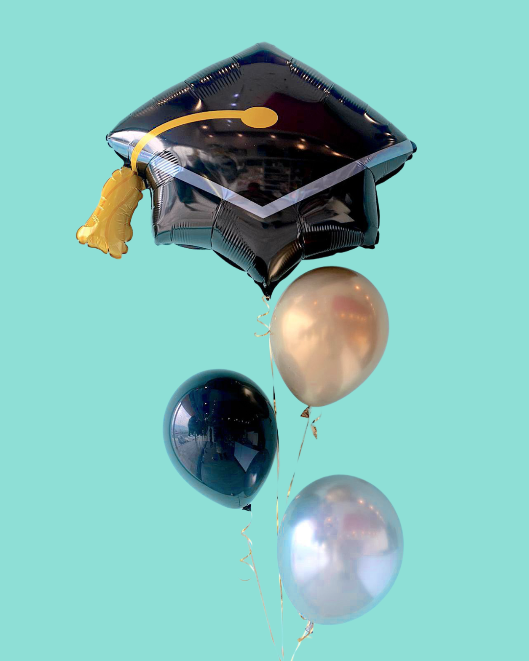 Globo metálico de 28” en forma de birrete decorado con dibujo de graduación y 3 globos látex.
