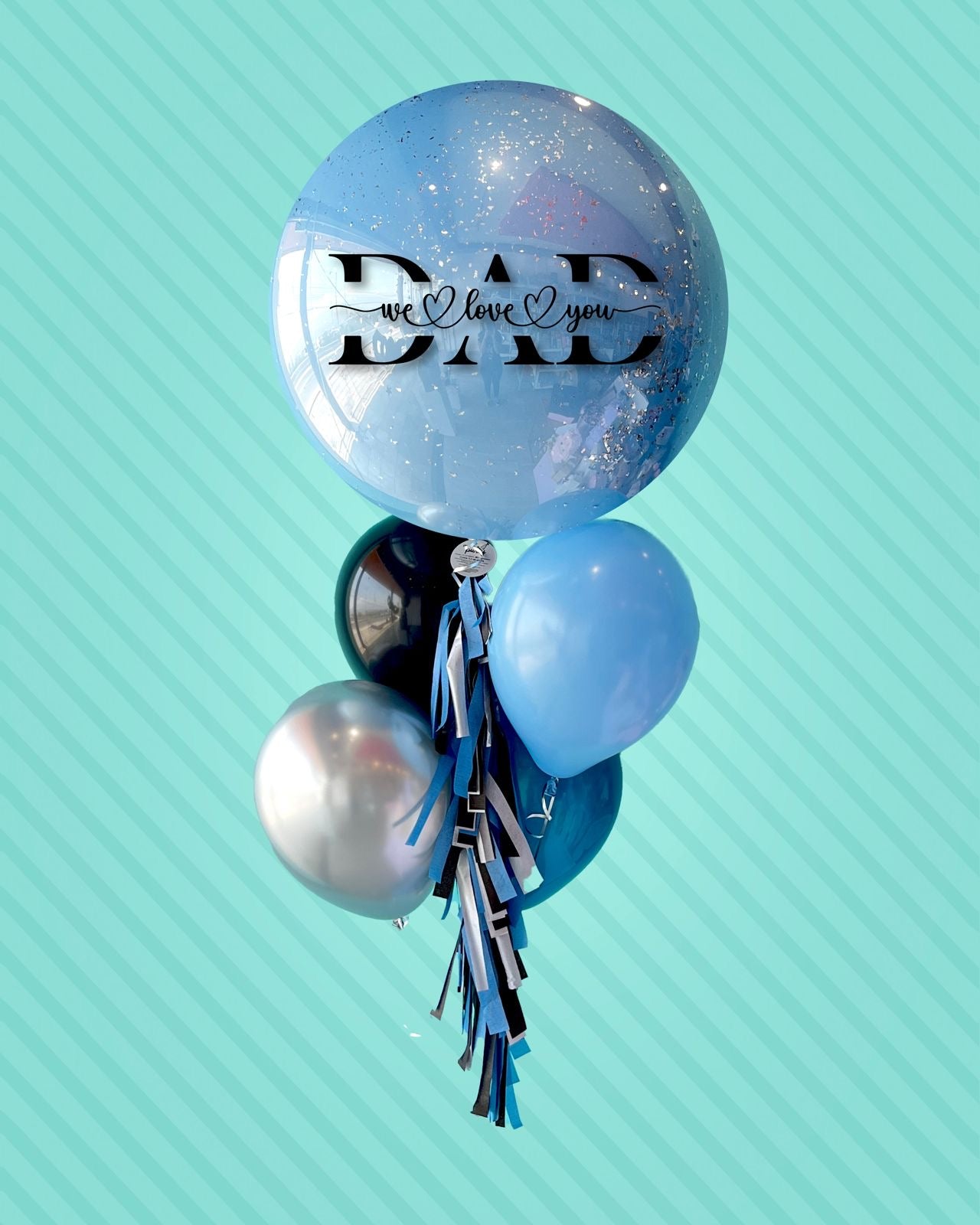 Burbuja personalizada 60 cm con confetti y globo látex gigante adentro, diseño dia del padre, y 4 globos látex.