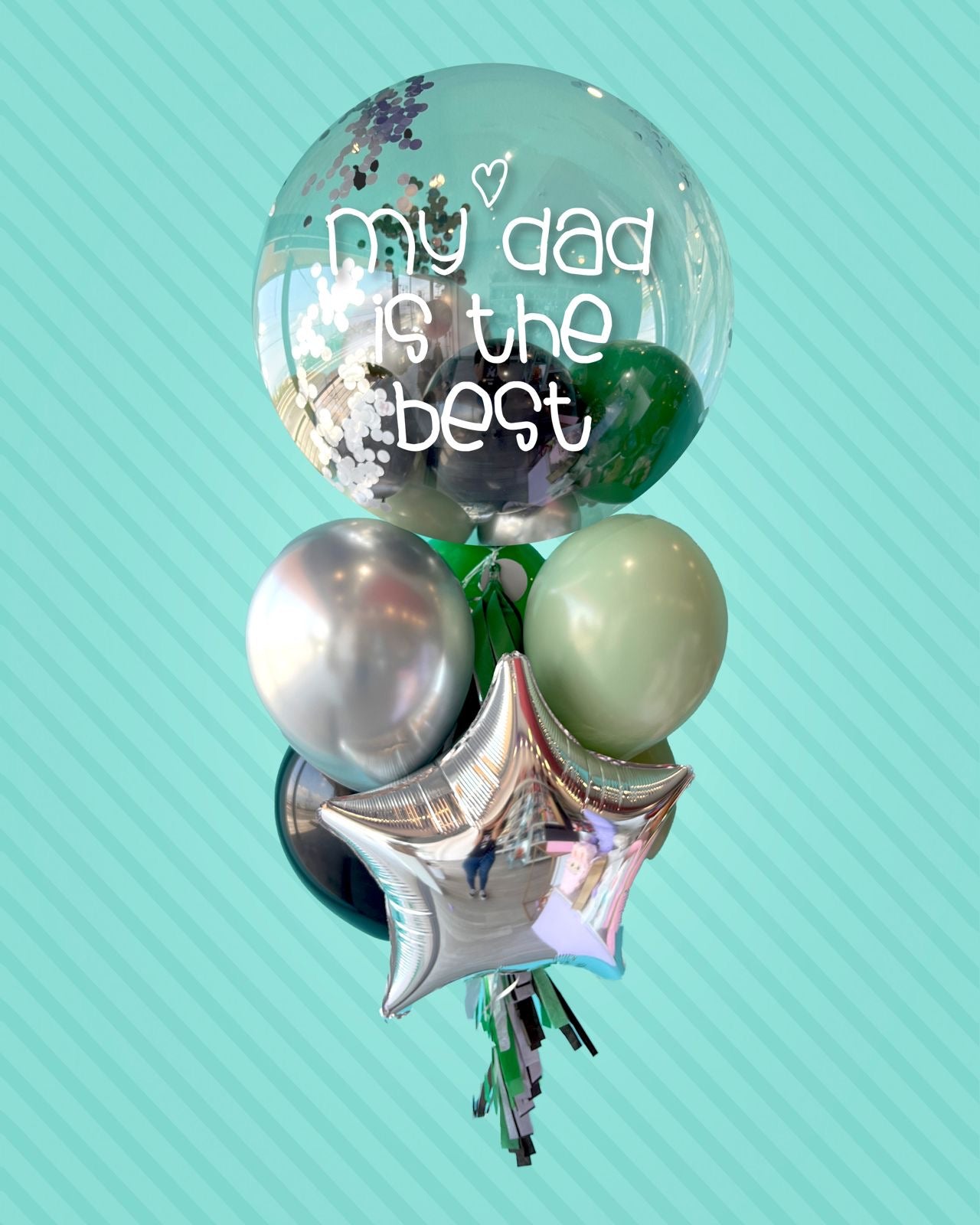Burbuja personalizada 60 cm con globitos adentro, diseño dia del padre, 5 globos látex y un globo estrella 18”.