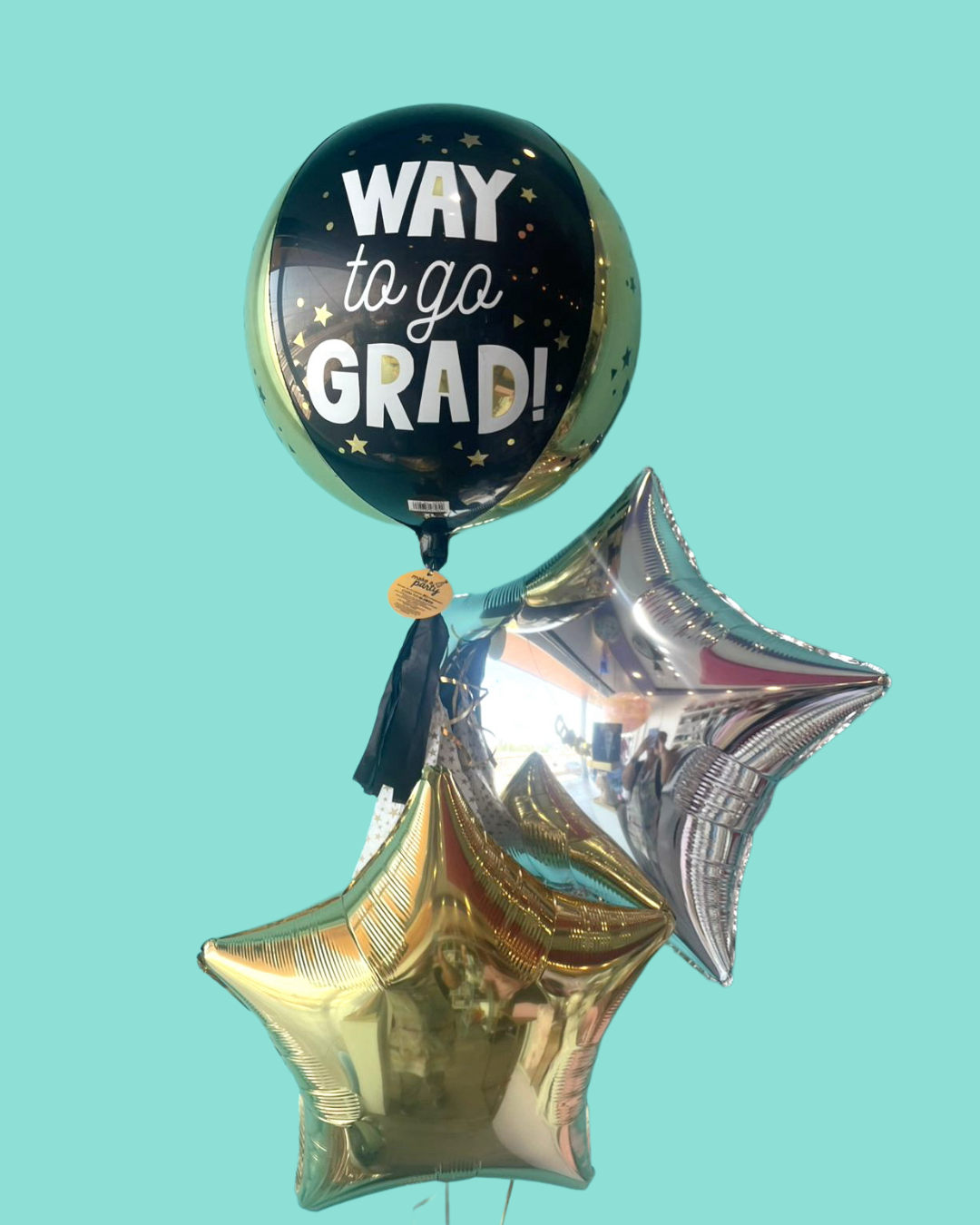 Globo metálico Orbz decorado con dibujo de graduación y 2 estrellas metálicas de 18”.