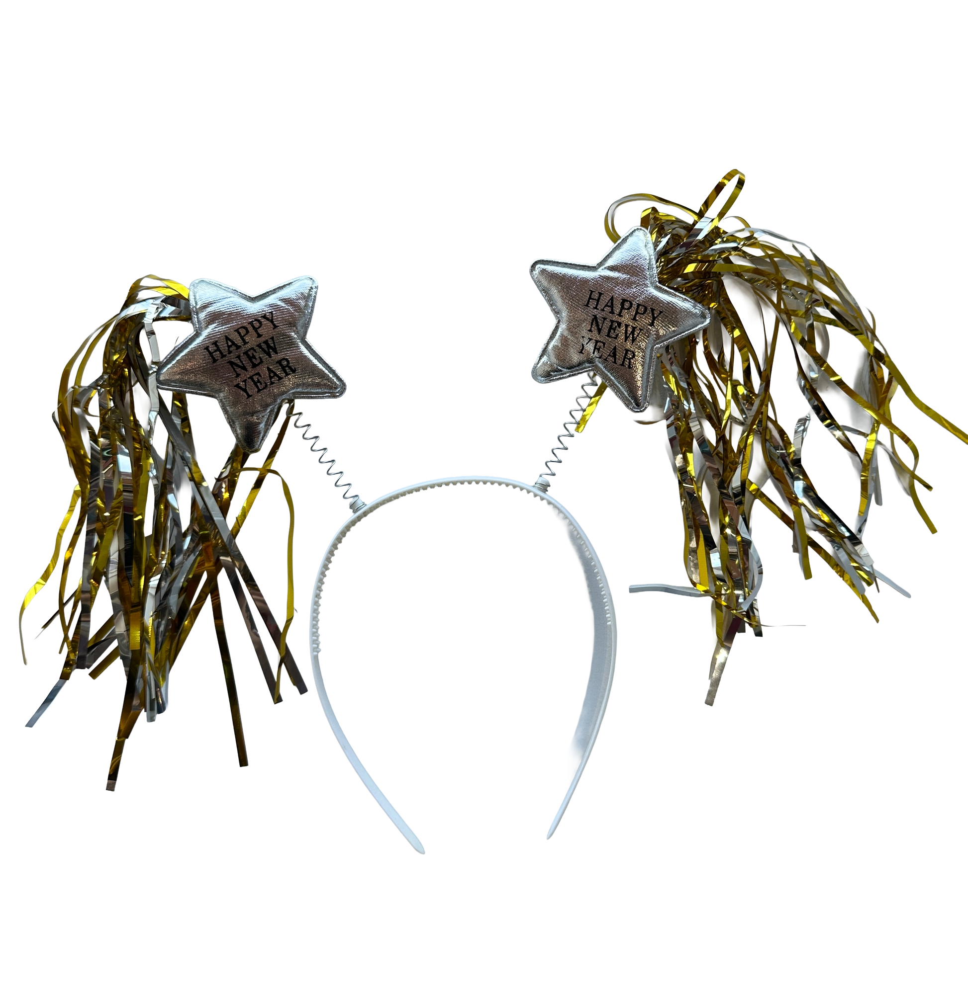 Diadema con estrella plateada Happy New Year y tiras metálicas. Incluye 1 pieza.